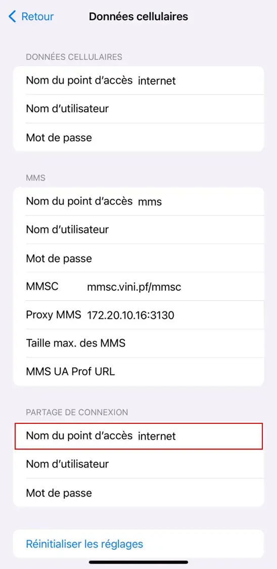 - Créez un nouveau point d'accès (APN) sur votre téléphone mobile avec les paramètres suivants (ignorer les autres paramètres) :