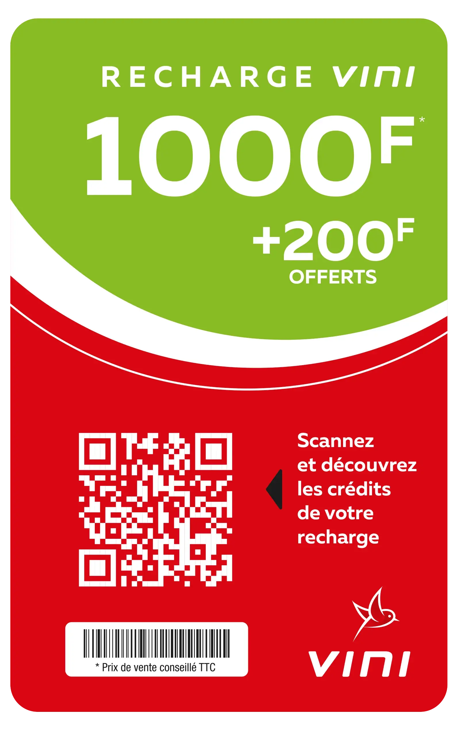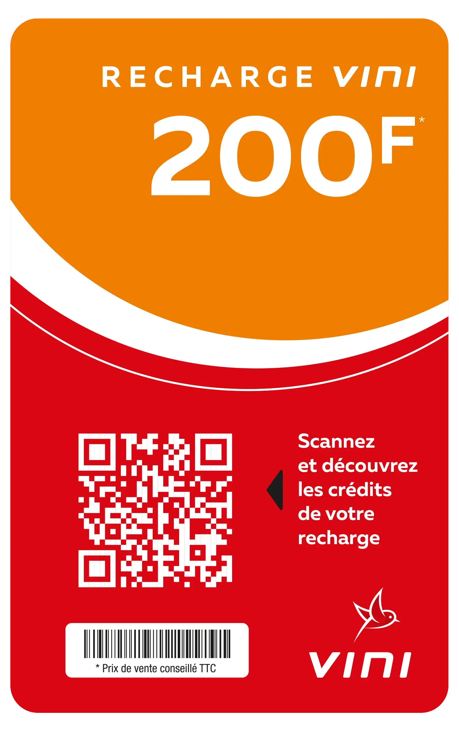 * Jusqu'au 31 mai 2026, bénéficiez de 10% de remise sur vos rechargements en ligne depuis l'Espace Client ou l'application Vini & Moi. Offre valable pour tout rechargement d'un montant minimum de 2 000 F.