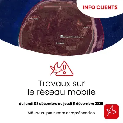 Nous vous informons que des travaux de maintenance sur le réseau MOBILE des TUAMOTU – RIMATARA, sont prévus du lundi 08 décembre au jeudi 11 décembre 2025.