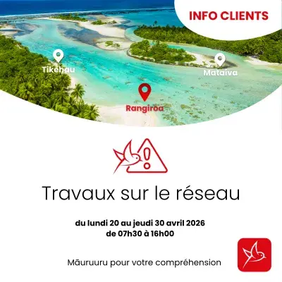 Nous vous informons que des travaux de modernisation du réseau sont prévus à Rangiroa, Tikehau et Mataiva, du lundi 20 au jeudi 30 avril 2026, de 08h00 à 16h00.