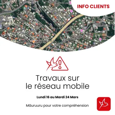 Nous vous informons que des travaux de maintenance du réseau mobile seront réalisés sur le site FAA’A – AUAE RDO, du lundi 16 mars au mardi 24 mars 2026, de 08h00 à 16h00.