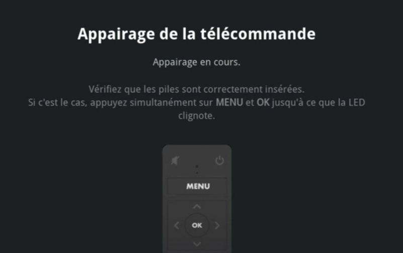 Si l’appairage automatique échoue, le décodeur va afficher le message complet qui invite à appuyer sur les touches MENU et OK simultanément.