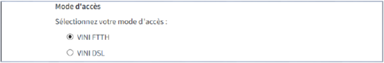 Etape 7 : Dans Mode d’accès, choisissez : VINI FTTH Puis saisissez votre nom d’utilisateur et votre mot de passe de connexion indiqués sur votre contrat Vini ou sur votre espace client Pour finir, cliquez sur Appliquer