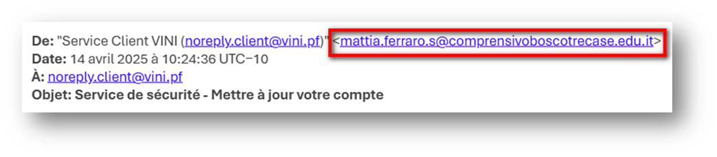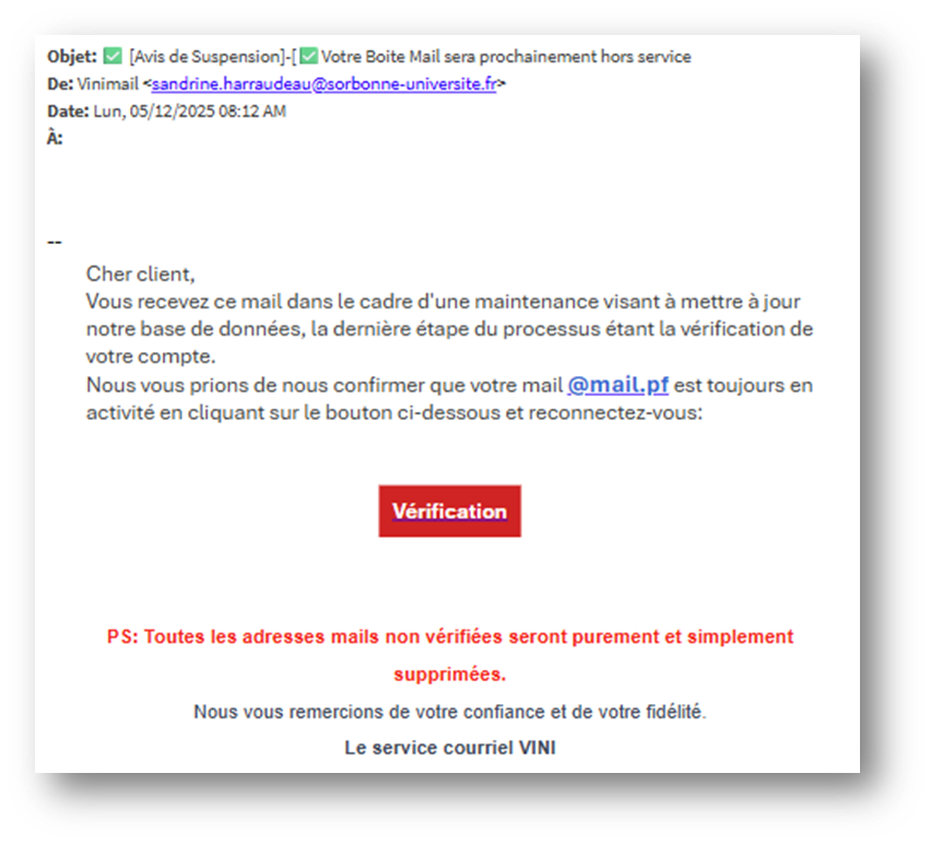 - Le message crée un sentiment d'urgence (compte bloqué, mise à jour obligatoire, etc.).
