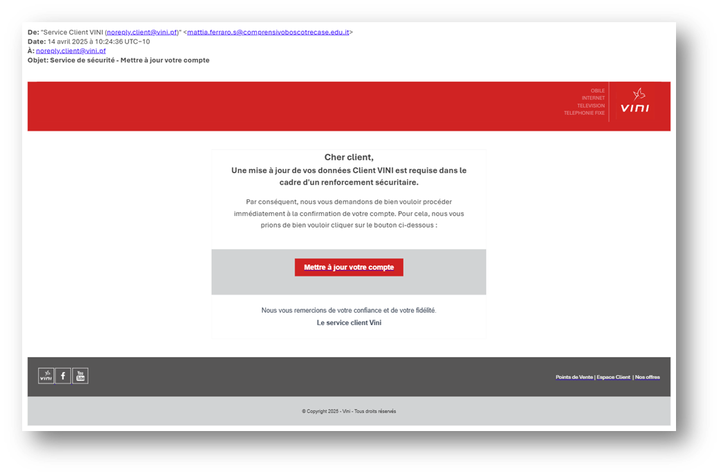 Nos communications officielles proviennent toujours d'adresses e-mail se terminant par "@vini.pf" ou « onati.pf » et de numéros de téléphone identifiables. En cas de doute, contactez directement notre service client au 3950 ou via notre formulaire en ligne.