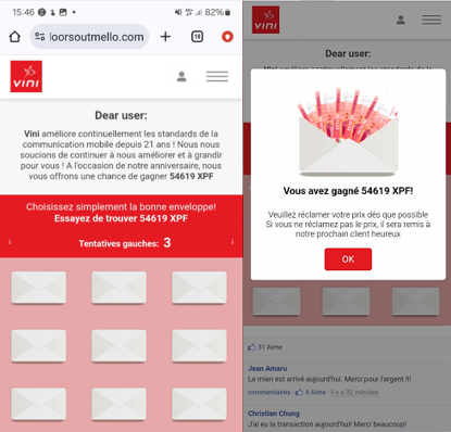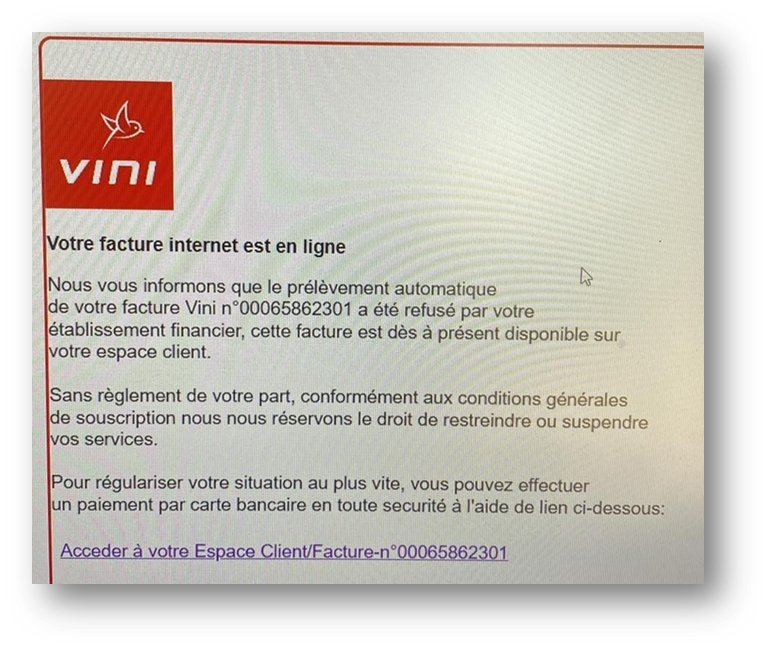 - L'expéditeur prétend être Vini mais l'adresse e-mail ou le numéro est suspect.