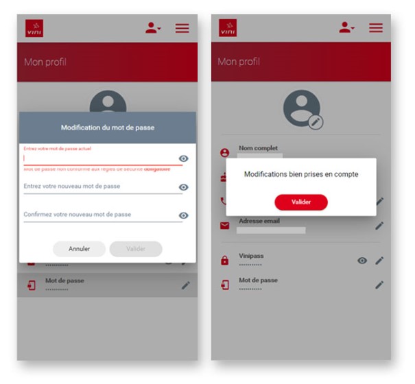 Pour changer votre mot de passe, entrez votre mot de passe actuel puis choisissez un nouveau mot de passe, confirmez votre nouveau mot de passe puis validez.