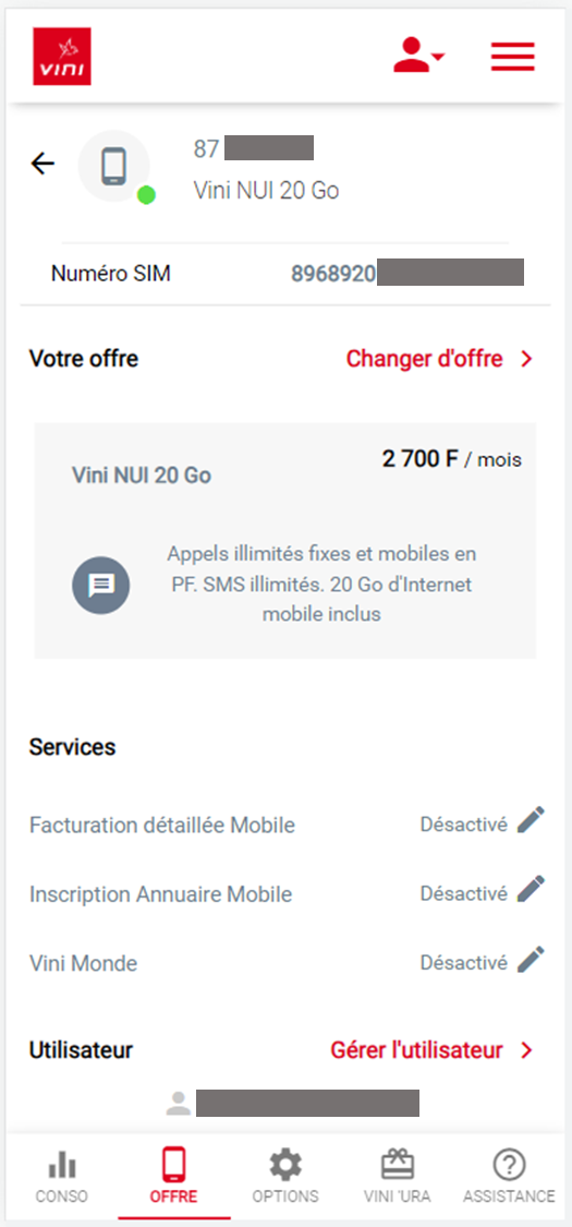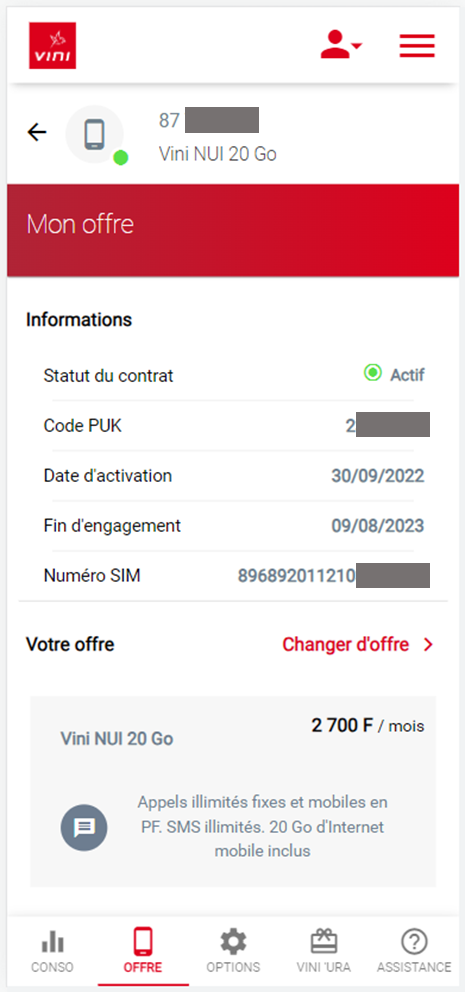 Sélectionner « offre » pour afficher les informations de votre abonnement mobile. Sur cette vue, vous pourrez voir le descriptif de votre offre.