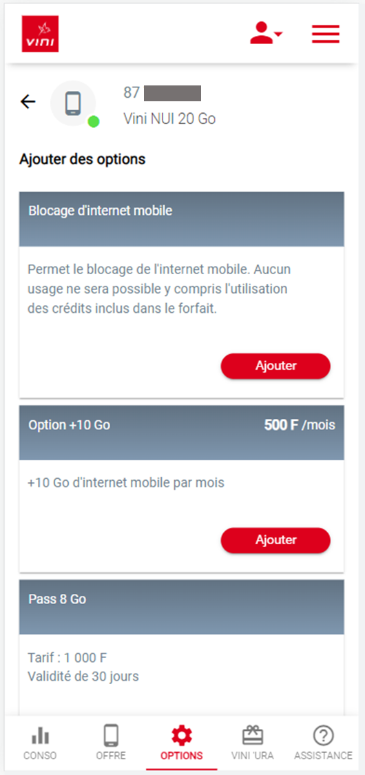 Sélectionnez « options ». Vous pourrez visualiser et modifier vos options ou bien en ajouter de nouvelles. Pour souscrire à une nouvelle option, cliquez sur « ajouter ».