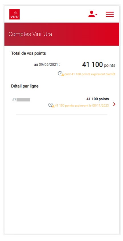 Après vous être connecté à votre Espace Client, cliquez sur l’icône à côté de l'icône menu dans le coin supérieur puis sélectionnez « Vini ‘Ura » pour consulter le solde de points de toutes les lignes de votre compte.