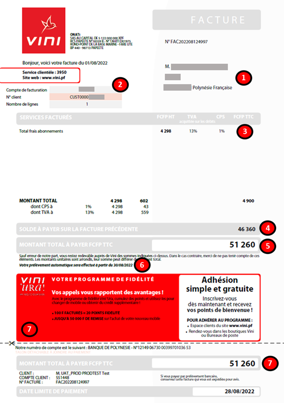 Retrouvez sous cet exemple de facture, les explications sur les différentes zones.
