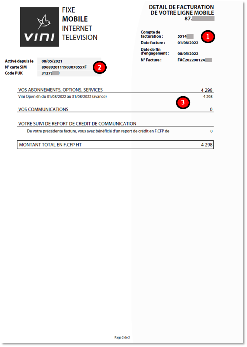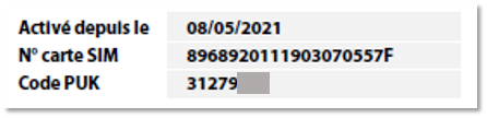 Cette zone indique les informations concernant la date de mise en service de votre ligne, les références de la carte SIM utilisée à la date d'édition de la facture et le code PUK associé à cette carte SIM.