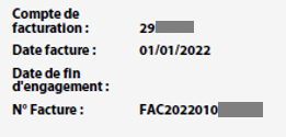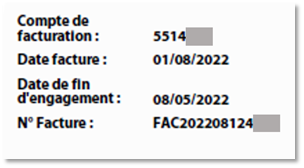 Cette zone indique le compte de facturation, la date de la facture concernée, la date de fin d’engagement de l’abonnement et le n° de la facture.