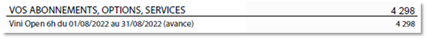 Cette zone indique l'intitulé et le montant de votre abonnement (forfait) et services optionnels facturés pour le mois écoulé.