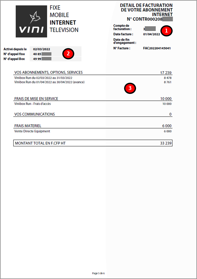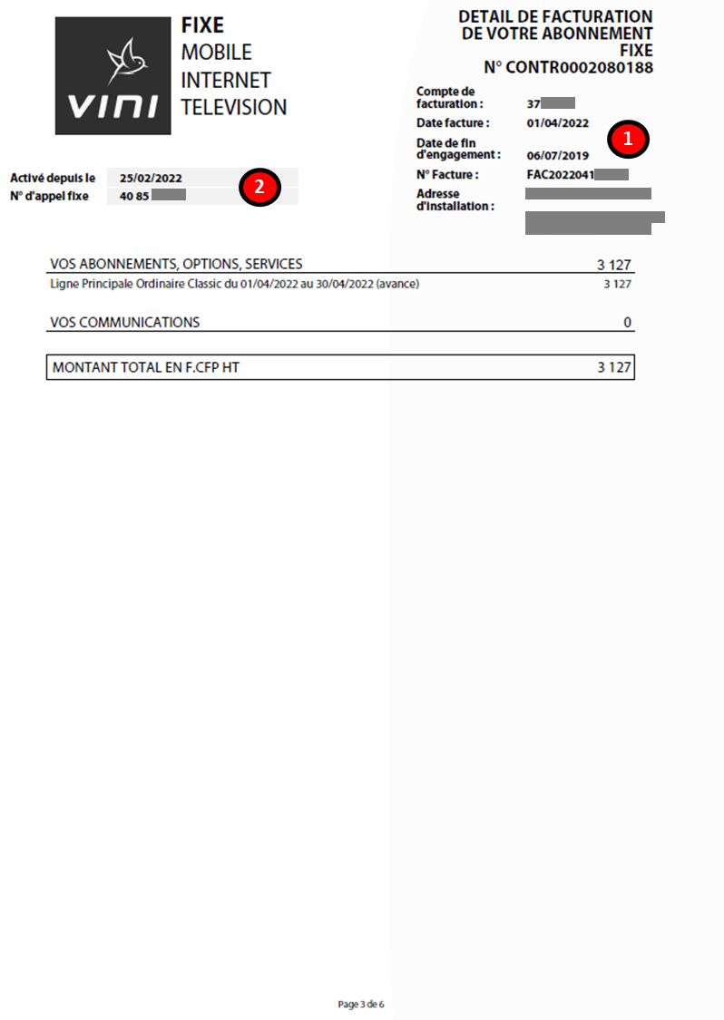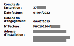Cette zone indique le compte de facturation, la date de la facture concernée, la date de fin d’engagement de l’abonnement, le n° de la facture et l’adresse d’installation.