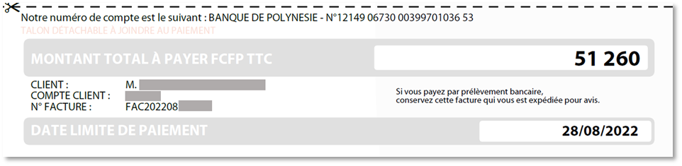 Cette zone indique le montant total à payer, facture précédente incluse, si aucun règlement n'est intervenu à la date d’édition de la facture.