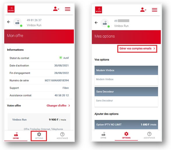 Puis sélectionnez votre abonnement Vinibox, puis dans vos options, sélectionnez « Gérer vos comptes emails ».