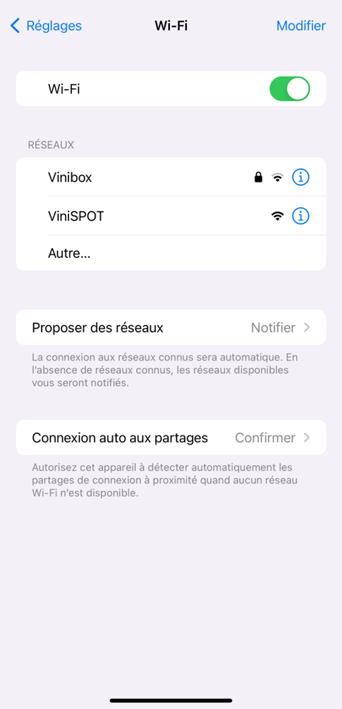 Afin de vérifier que vous êtes bien dans une zone ViniSPOT Vérifiez que vous détectez bien le service dans vos réseaux Wi-Fi :