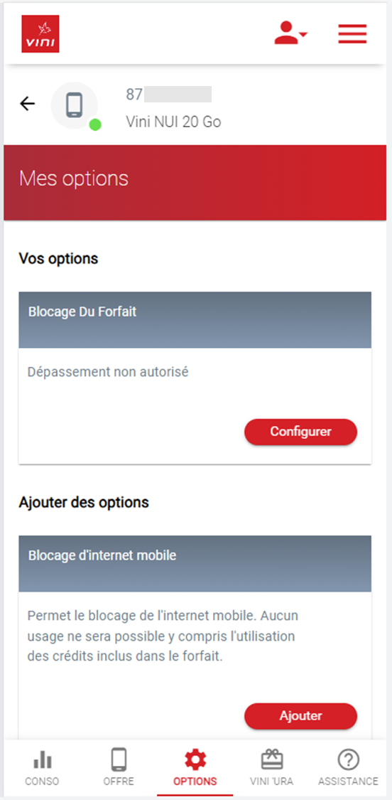 • Depuis l’application Vini & Moi ou bien votre Espace Client en ligne, rendez-vous dans l'onglet option de votre forfait mobile et sélectionnez l'option de blocage de votre choix :