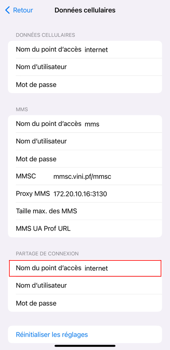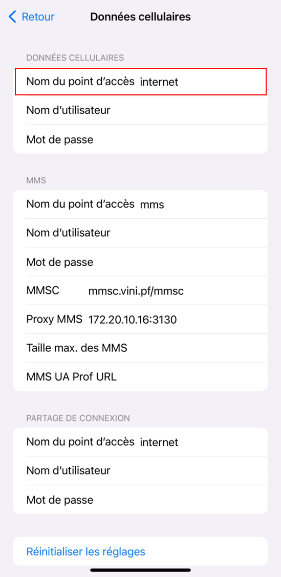 2. Dans la section Données cellulaires, entrez « internet » dans le paramètre Nom du point d'accès.