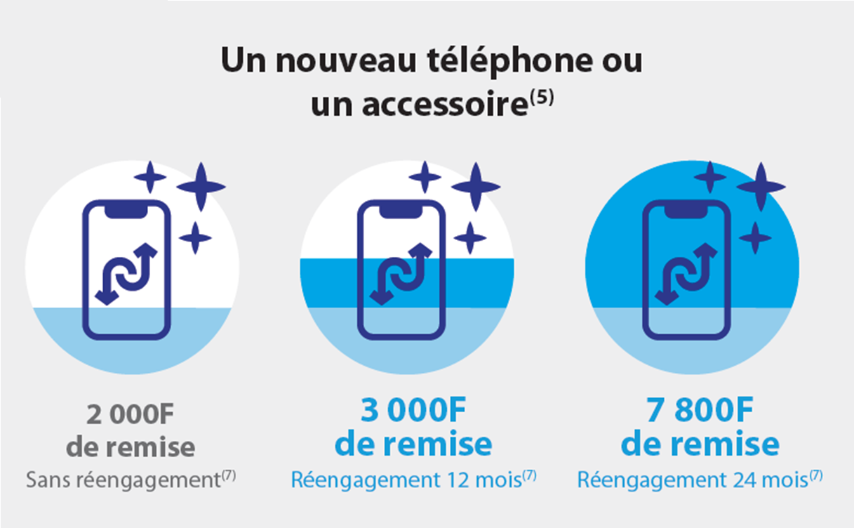 Il suffit d’envoyer le code « MOBILE » par SMS (GRATUIT) au 7100 pour connaître le montant de sa remise Api Mobile avec un réengagement 24 mois. Pour + infos sur les remises, rendez-vous en boutique.