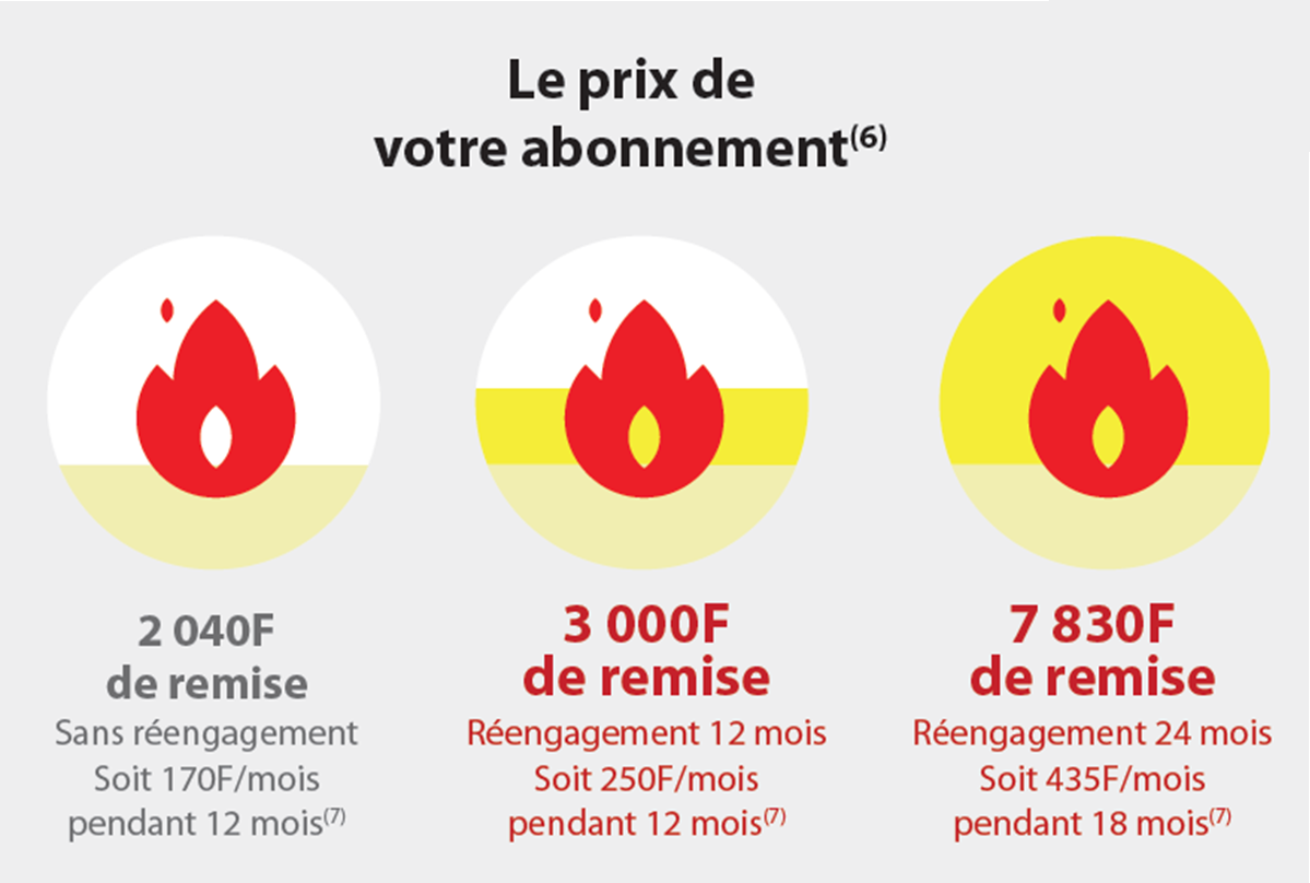 Il suffit d’envoyer le code « ABO » par SMS (GRATUIT) au 7100 pour connaître le montant de sa remise Burn Forfait avec un réengagement 24 mois. Pour + infos sur les remises, rendez-vous en boutique.