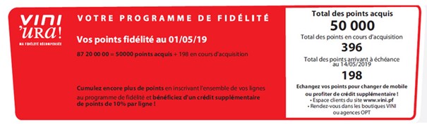 • Exemple : pour une facture mensuelle de 6 000F pour une ligne inscrite au programme de fidélité et appartenant à un compte multilignes, le nombre de points gagnés sera de 1 200 points cumulés + 120 points de bonus multilignes.