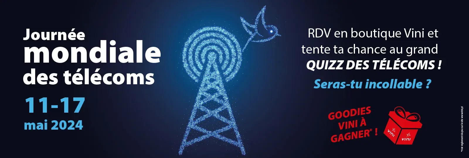 Le 17 mai, c'est la journée mondiale des télécoms ! Mais chez Vini, nous prolongeons la fête toute la semaine avec une série d'animations et de jeux dans nos boutiques !