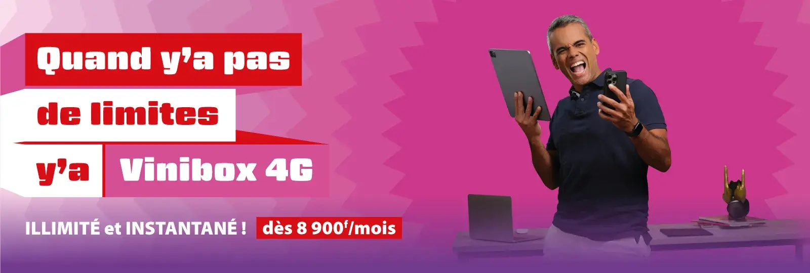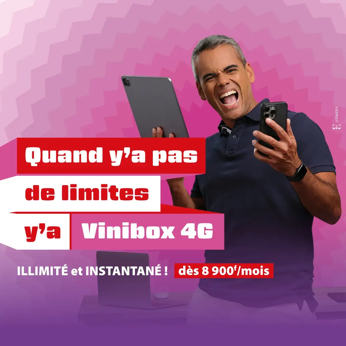 **L'offre Vinibox 4G/5G illimité « Standard » possède un quota de 400 Go. Une fois le quota épuisé, le débit est réduit à 1 Mb/s – 256 Kb/s. Également disponible avec engagement 12 mois à 9 900 F (routeur 5G à 14 900 F) ou sans engagement à 10 900 F (routeur 5G à 29 900 F).