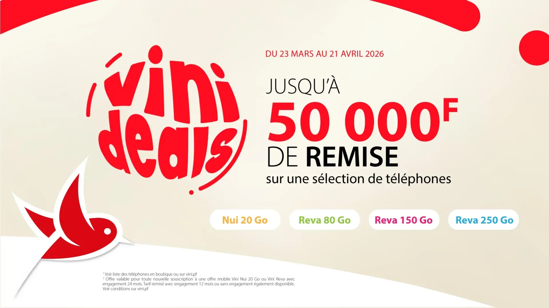 Migration : Les migrations vers les forfaits Vini Iti, Vini Nui et Vini Reva sont non réengageantes. L’octroi simultané d’une subvention sur l’achat d’un terminal est conditionné par un réengagement de 12 ou 24 mois.