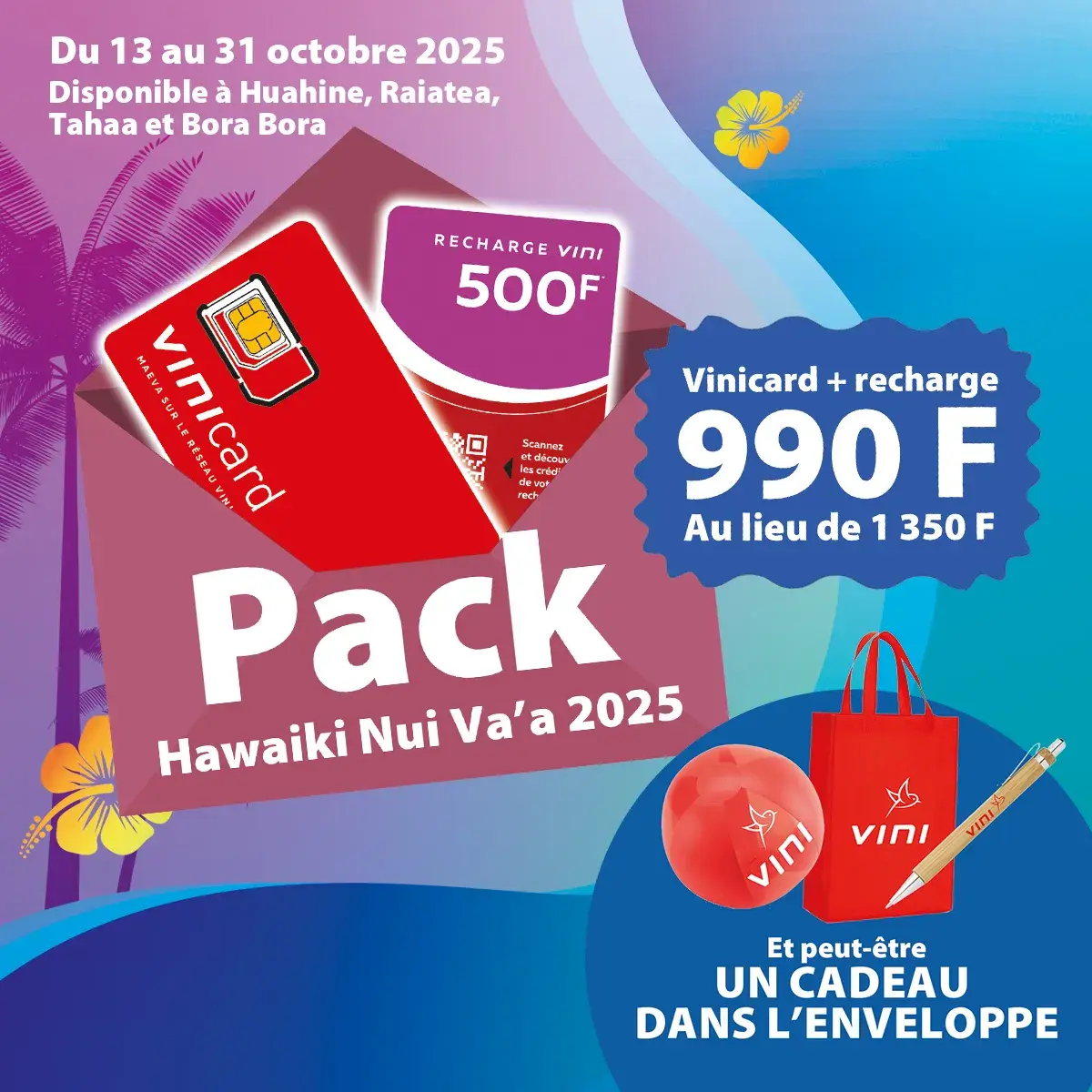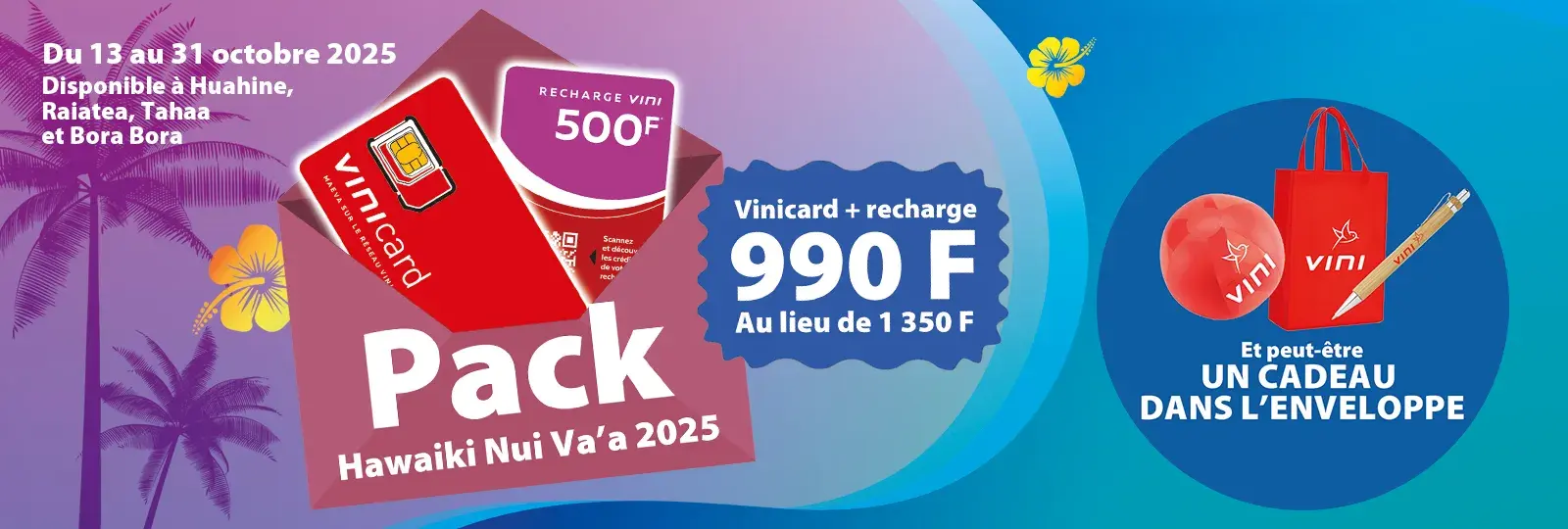 Profitez du Pack exclusif Hawaiki Nui Va’a 2025* : Vinicard 4G + recharge 500 F à seulement 990 F (au lieu de 1 350 F) !