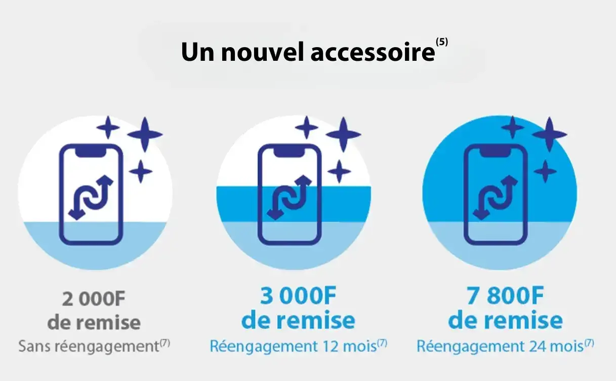 • Sans réengagement, j’ai plus de liberté. J’utilise mes points pour acheter un accessoire* à un prix réduit sans me réengager.  Je bénéficie de 1F de remise sur mon accessoire* connecté tous les 10 points utilisés.