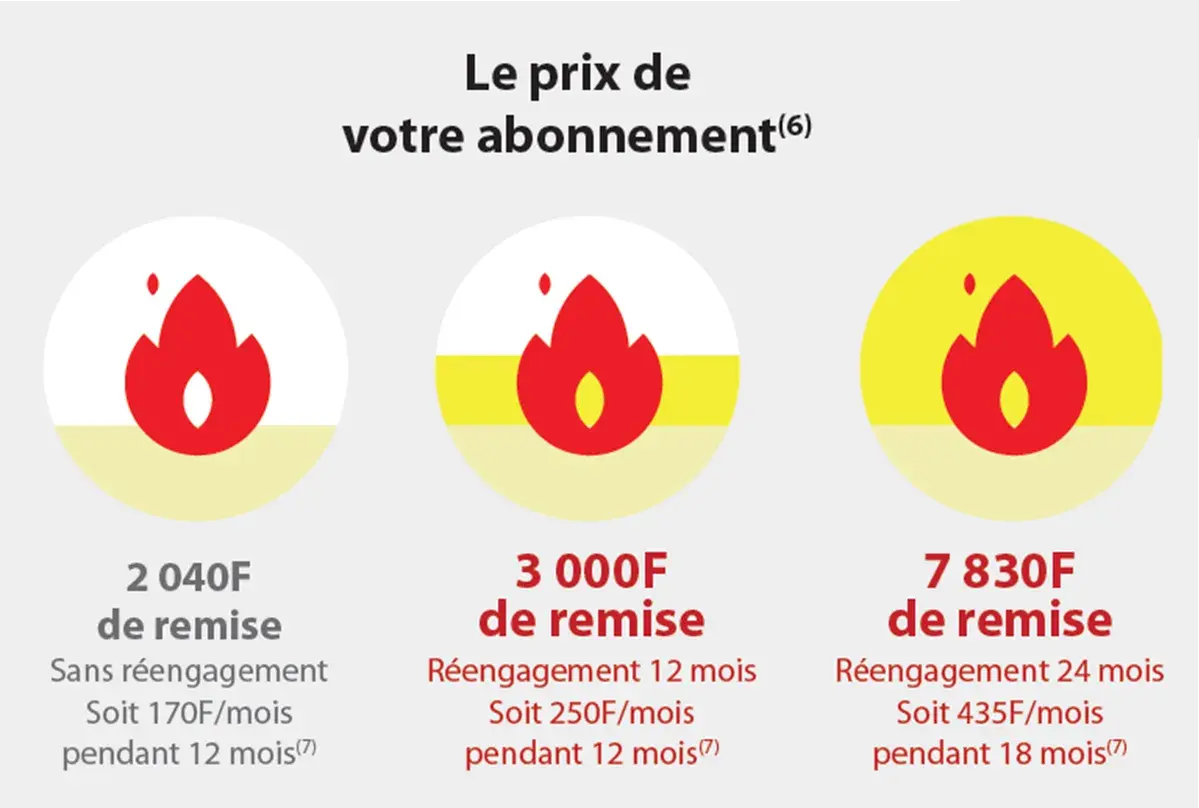 (7) Sans réengagement cela équivaut à 1F de remise tous les 10 points utilisés. Avec réengagement (12 ou 24 mois), les avantages sont plus importants : vous bénéficiez à la fois de la remise de 1F tous les 10 points utilisés + d’une remise supplémentaire calculée en fonction de votre forfait et de la durée de réengagement. Le montant de la remise Vini'Ura sera déduite du tarif nominal du terminal, de l'accessoire ou de l'abonnement choisi.
