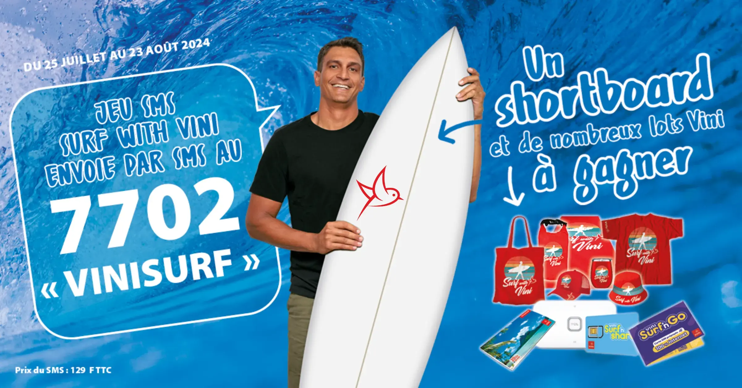 2024 c’est l’année du surf et pour la célébrer, Vini lance un grand Jeu SMS pour vous faire gagner une planche de Surf de la marque Infinity board et plein d’autres lots. Un modèle de planche « shapé » sur-mesure pour les vagues de Polynésie, les vagues de récifs et notamment pour les waves de Teahupo’o. En collaboration avec Tikanui SMITH, surfeur professionnel de grosses vagues et ambassadeur de la marque Vini.