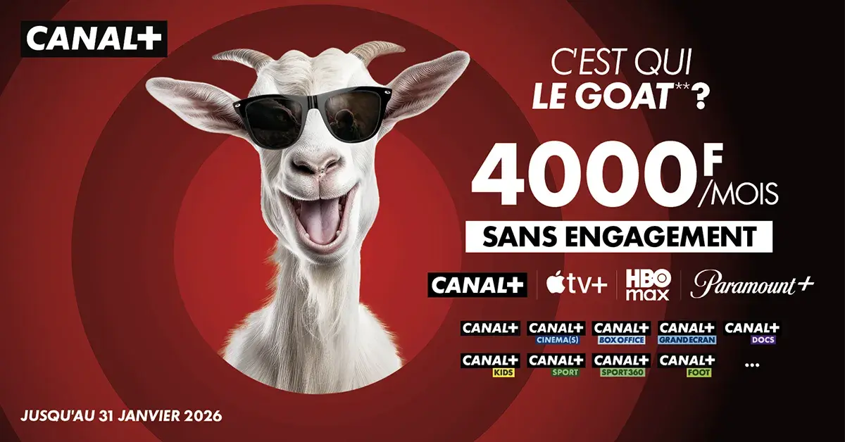 Offre GOAT+ au tarif de 4.000 FCFP/mois avec abonnement mensuel, valable en Polynésie Française du 03/11/2025 au 31/01/2026 pour tout nouvel abonnement (toute personne non abonnée aux offres CANAL+ au cours des 6 derniers mois). L'abonné n’est pas éligible à la souscription d’option ou service additionnel en dehors de ceux expressément inclus dans son offre. Toute modification d’offre implique la résiliation du contrat en cours et la souscription d’une nouvelle offre.