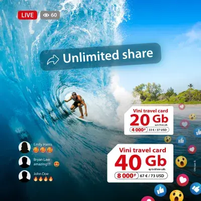 To connect to Vini’s network, switch on your cellphone once you pass the Custom services at the airport, once you see the ‘VINI’ logo on your device screen, you are connected. If you are having trouble connecting, make a manual research on your device : Network settings > Network selection > Manual research.
